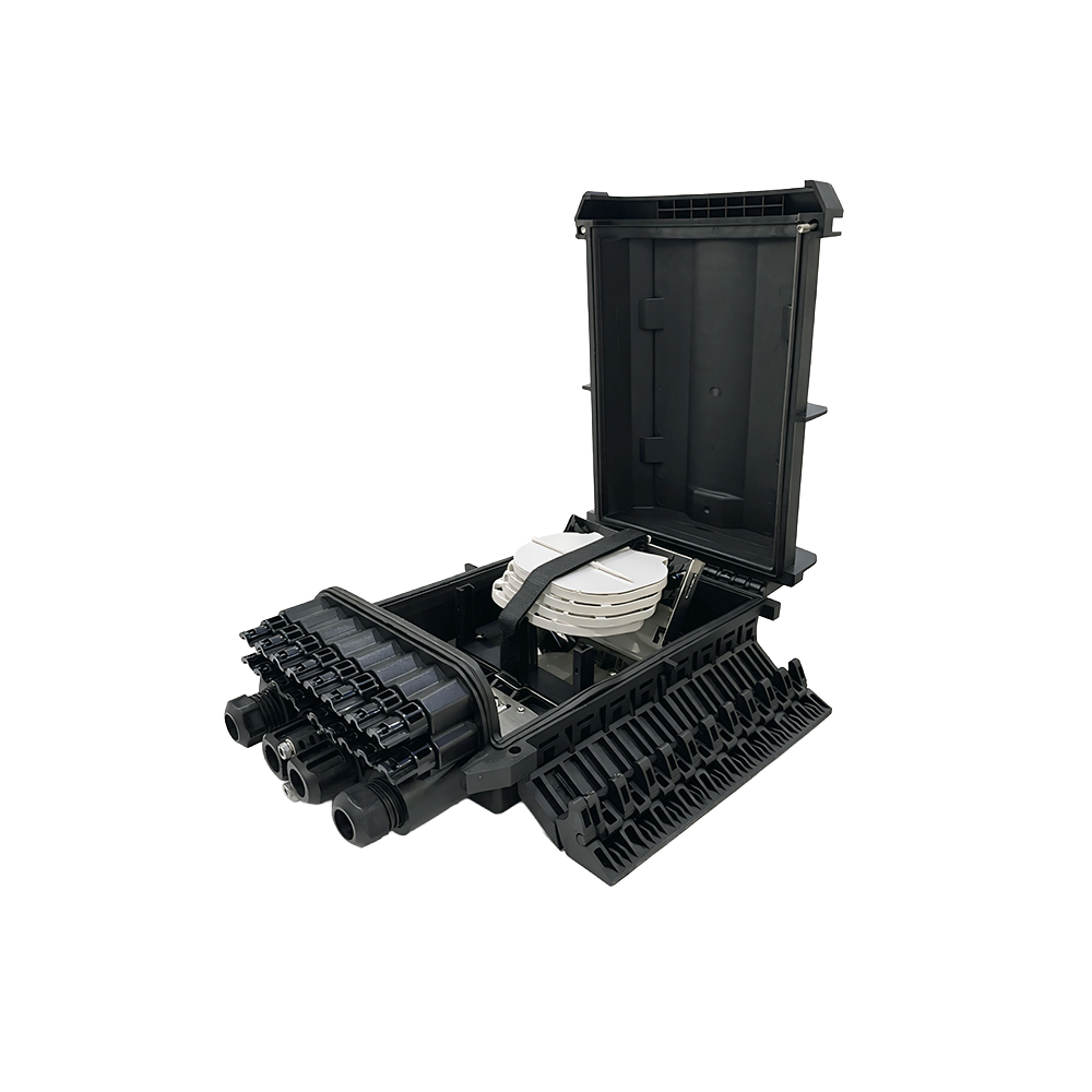 Es una caja de terminación robusta con clasificación IP68, diseñada para conectar cables de alimentación a cables de derivación en sistemas FTTx. Con capacidad para hasta 48 empalmes de fibra y 16 puertos, esta caja integra empalmes, divisiones y gestión de cables de fibra en una sola unidad protegida. Su robusta construcción con materiales de alta calidad la hace adecuada para instalaciones tanto en interiores como en exteriores, garantizando durabilidad y fiabilidad.